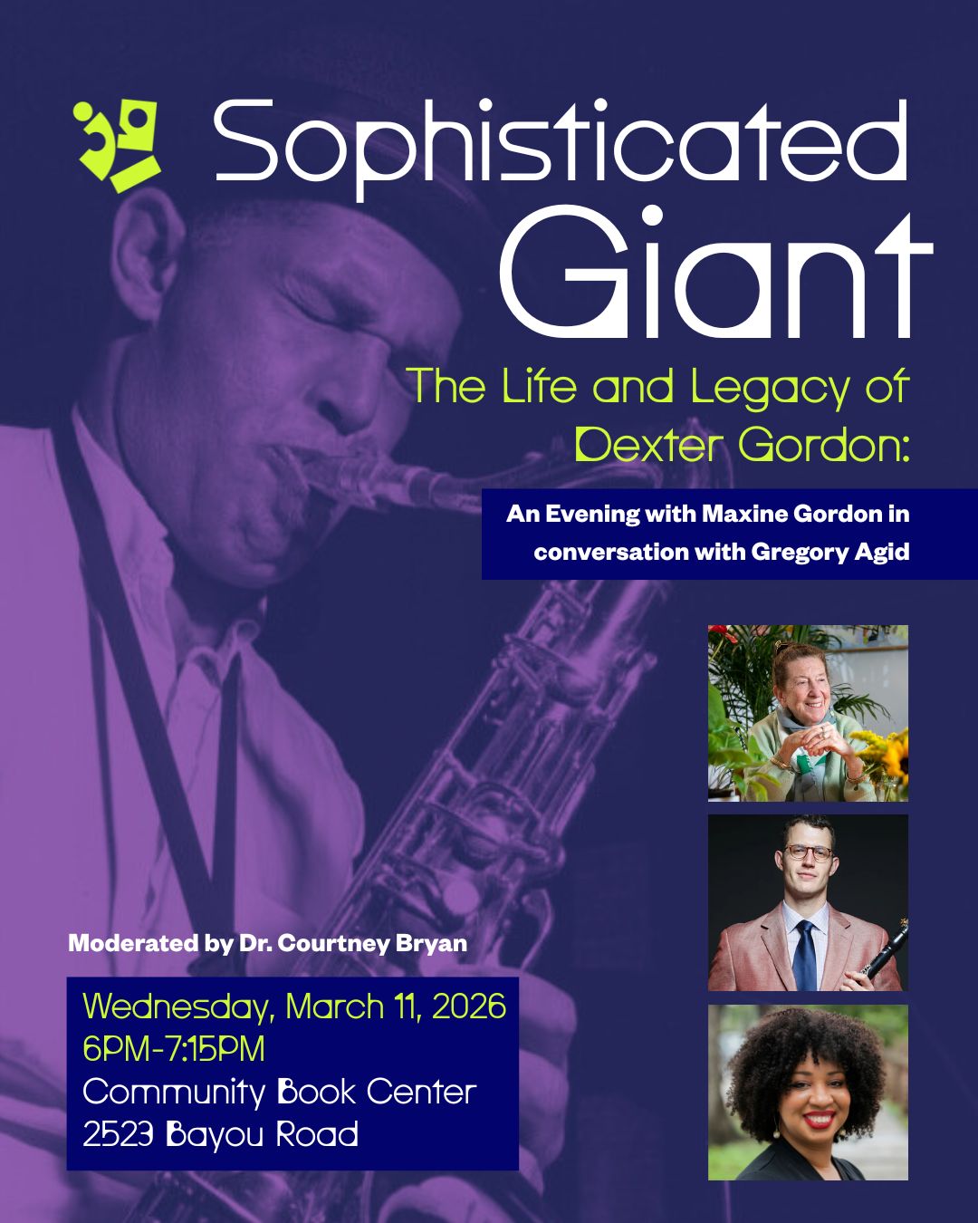 Next Wednesday, March 11, Maxine Gordon, one of our Bamboula residents this season, will be in conversation with jazz clarinetist and saxophonist, Gregory Agid and Courtney Bryan about Gordon’s book, Sophisticated Giant: The Life and Legacy of Dexter Gordon. RSVP for both events on Eventbrite.